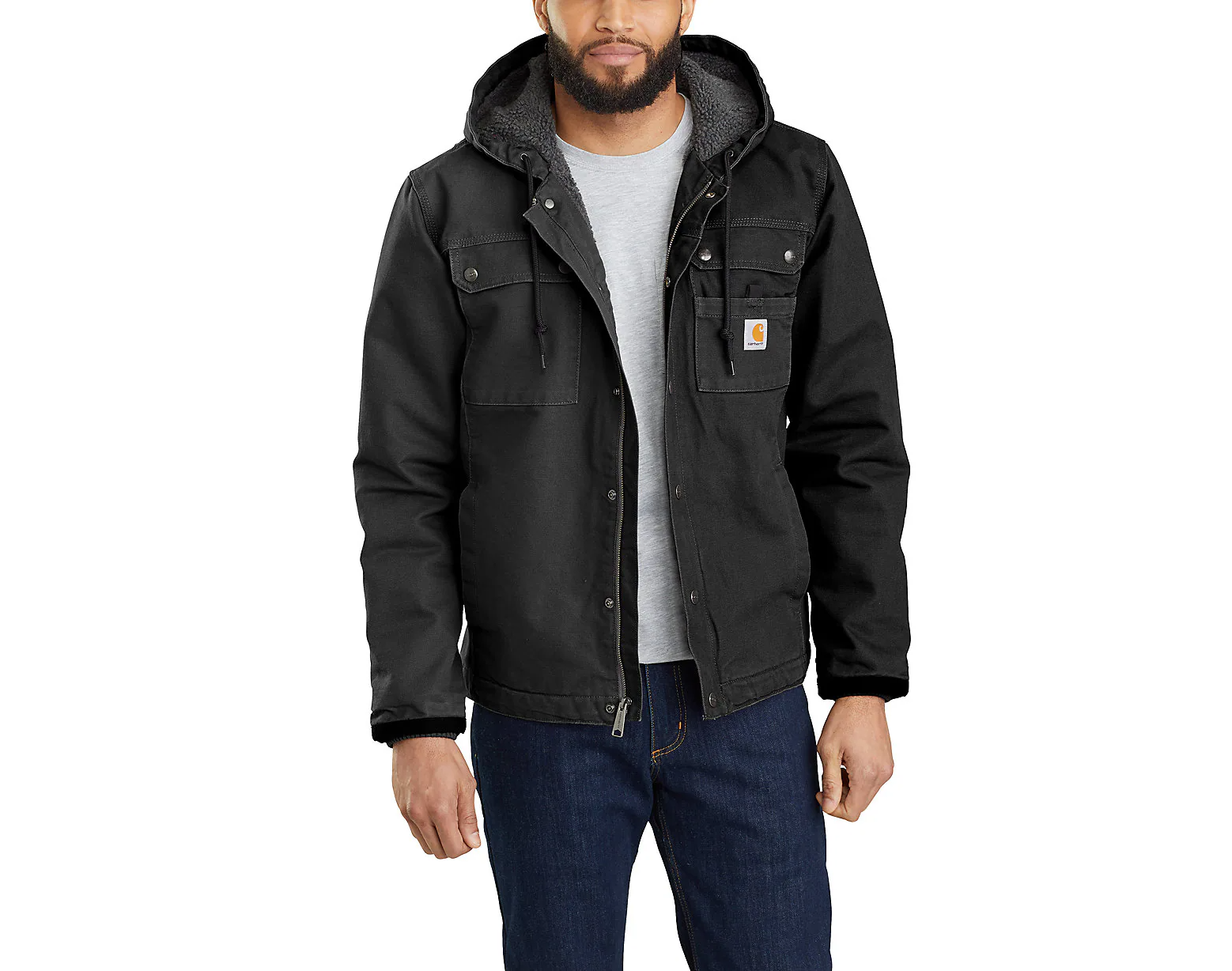 This men's jacket is built to endure cold, wind, and tough days on the job. Rugged without being rigid, it's made with durable cotton duck and is reinforced with Cordura® at wear points along the cuffs. This warm layer is lined with soft sherpa fleece through the body and hood, with warm quilted nylon through the sleeves. Previously known as the Washed Duck Bartlett Jacket.