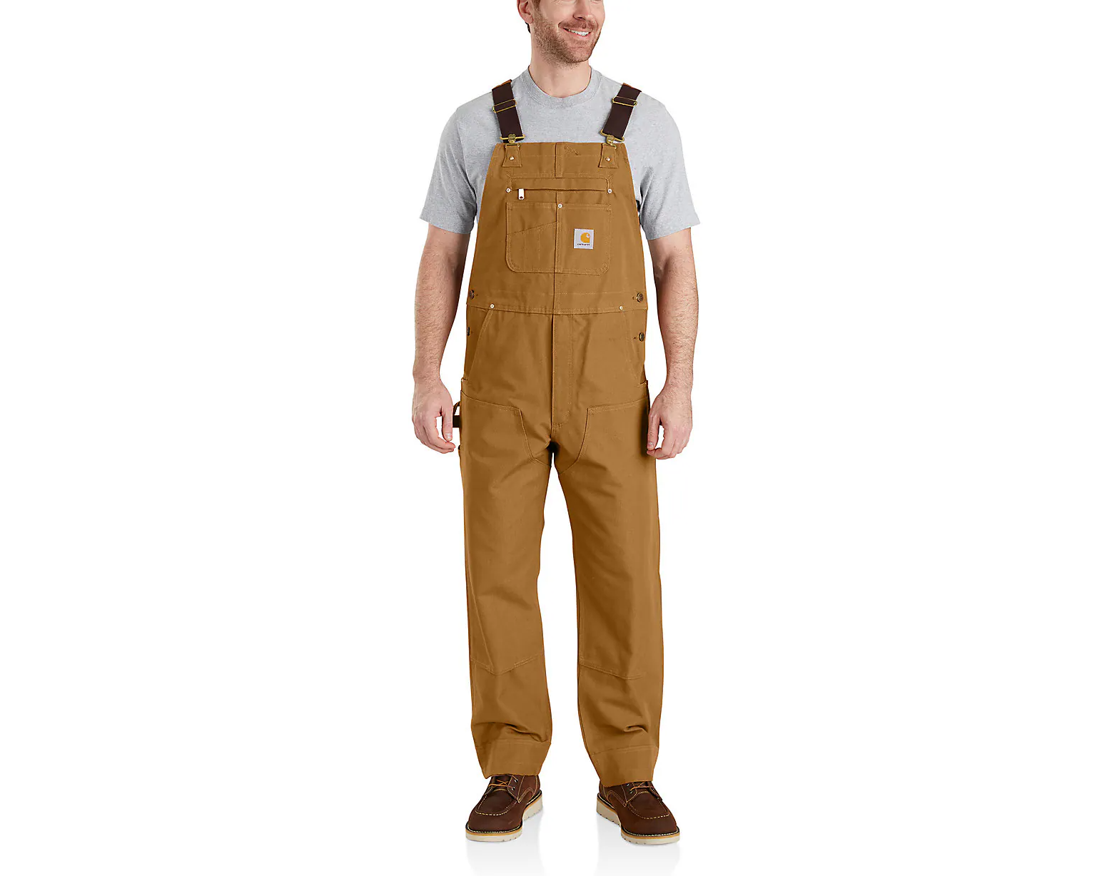 An update to our most popular unlined bib, the R01, these men's overalls were designed using feedback from our Carhartt Crew. Every detail, from the front-to-back kick panel on the cuffs to the extra stretch around the waist, was informed by the hardworking people who wear our gear day-in and day-out. Dependable and durable, the bibs are made with our heavyweight cotton duck. They have elastic suspenders, a double layer at the knees, and ample pockets.