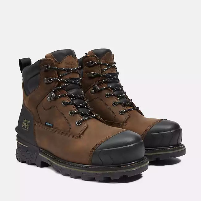 These rugged, waterproof boots are designed to tackle slippery and wet job sites. Our Boondock HD boots are made of Premium Timberland® waterproof leather uppers with an internal waterproof membrane that makes them impervious to the wettest conditions and blood-borne pathogens. We added electrical hazard protection, composite safety toes powered by Carbon Shield™ technology for extra strength, molded Vibram rubber toe protectors, ExoSpine™ technology and fiberglass shanks for lasting structural support, plus Vibram Fire & Ice™ rubber outsoles that maintain their flexibility in freezing temperatures. For all-day comfort, you'll find StepPropel™ footbeds that compress to store your energy and then rebound to release that energy back to your feet with every step, breathable and moisture-wicking linings made of ReBOTL™ material containing at least 50% recycled plastic, and an antimicrobial treatment to help keep them smelling fresh.